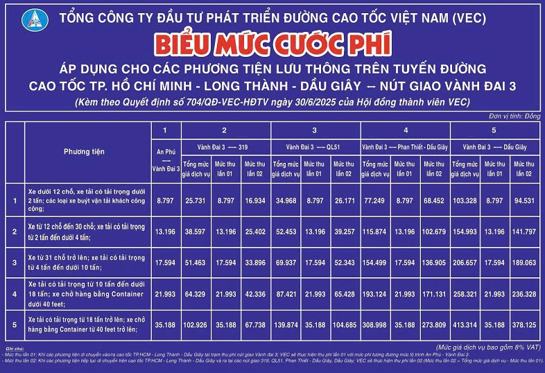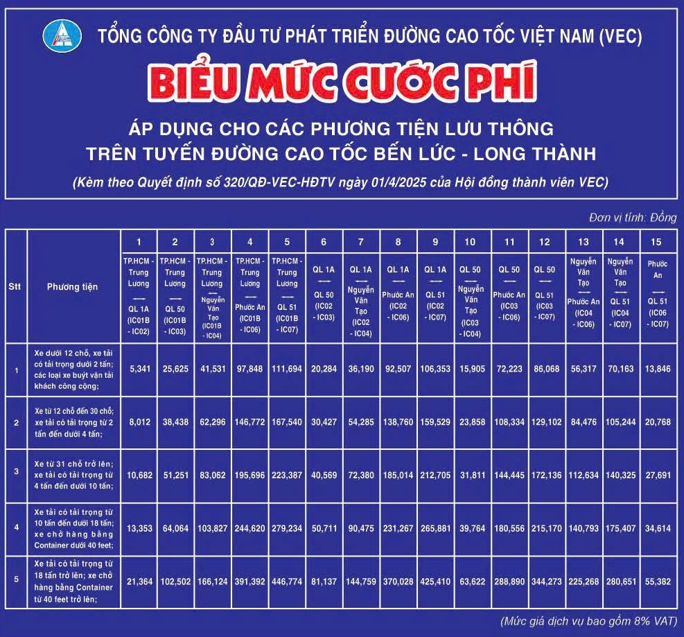 BIỂU MỨC CƯỚC PHÍ TRÊN ĐƯỜNG CAO TỐC BẾN LỨC - LONG THÀNH TỪ 00H00, NGÀY 10/8/2025
