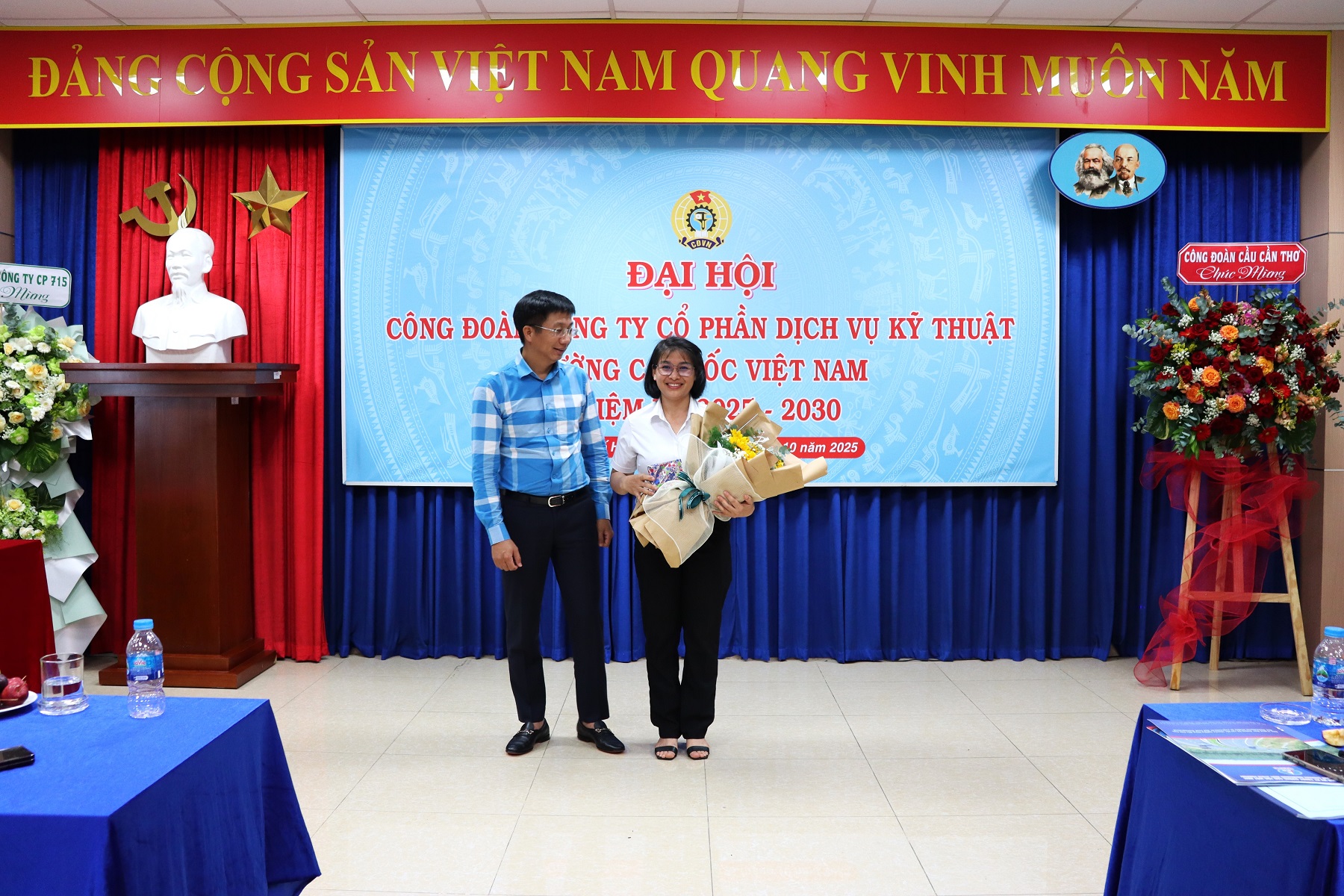 Đ/c Đặng Hoài Nam – Ủy viên BCH Đảng bộ, Phó Tổng giám đốc, Ủy viên Ban thường vụ Công đoàn VEC, Chủ tịch HĐQT Công ty VEC E và đ/c Nguyễn Viết Tân - Bí thư Chi bộ, Giám đốc Công ty VEC E cùng các đồng chí đại biểu khách mời tặng hoa chúc mừng cho BCH Công đoàn VEC E nhiệm kỳ 2025 – 2030